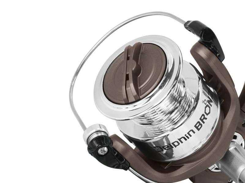 Delphin Bronz to stylowy, kompaktowy kołowrotek z przednim hamulcem. Występuje w kolorze ciemnego brązu połączonego z neutralnym brązem ze srebrnymi detalami i srebrną szpulą. Ten kołowrotek ma bardzo ładny design, jest niezawodny i niedrogi.