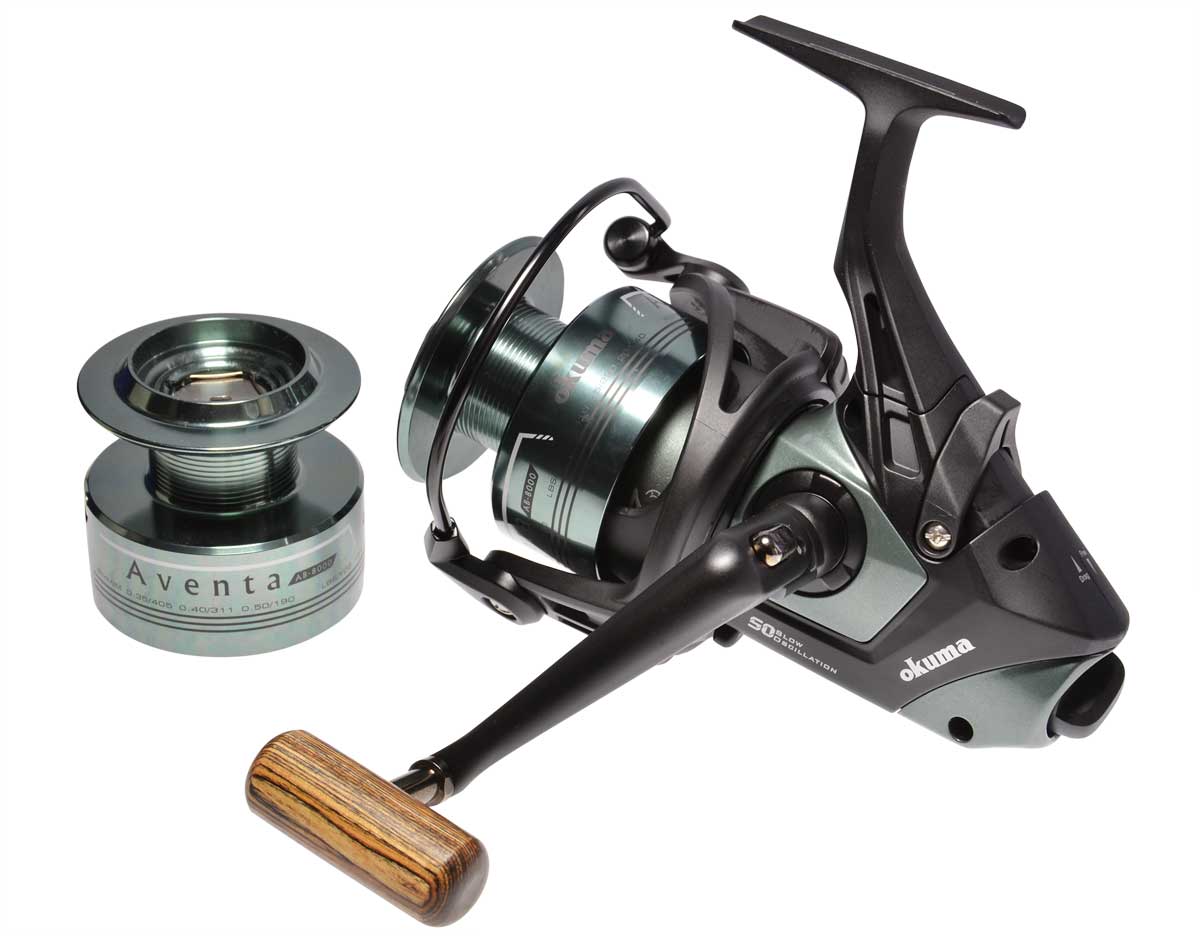 W zestawie kołowrotek Okuma Aventa Baitfeeder 6000 z dwoma aluminiowymi szpulami.